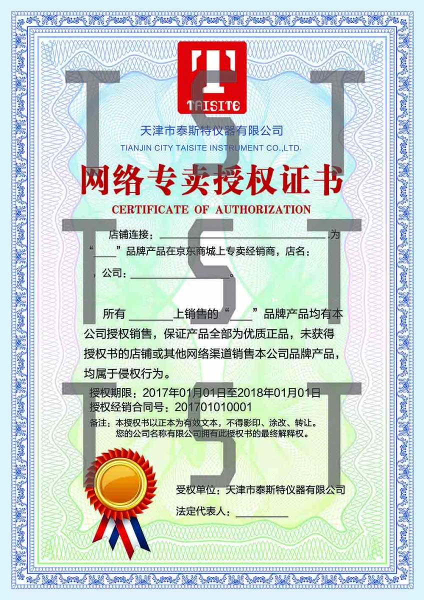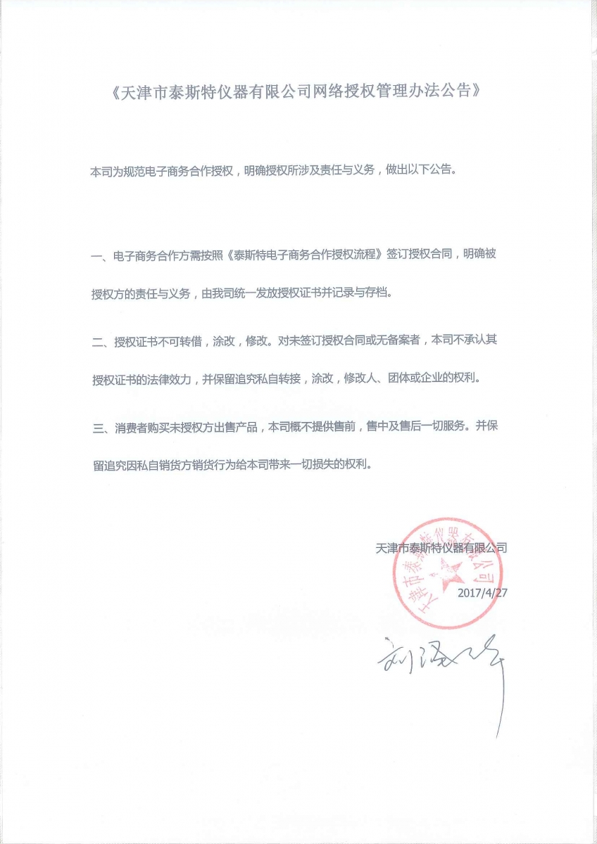 《天津市泰斯特儀器有限公司網絡授權管理辦法公告》